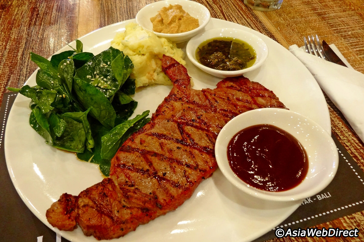 Tokyo Skipjack Seminyak is a hidden gem. It is one of the finest spots in Bali’s premier dining destination of Seminyak where you can enjoy top quality steaks at very affordable prices. This inconspicuous Japanese themed grill and steakhouse is tucked away on the second floor of a row of fashion boutiques on Jalan Kayu Cendana, right across the road from the Seminyak Square. Open for lunch and dinner, this loft restaurant features a menu that specialises in steaks and offers a concept of East meets West through its choice of unique sauces and sides that go with every order.As the second outlet to open after the first Tokyo Skipjack in Jakarta, which was established mid 2012, this branch continues the brand’s legacy and goes by its proud motto of making ‘good food accessible to all’. The group of friends behind the venture decided upon the quirky and catchy name at that time, reflecting the first restaurant’s location within a special court of a supermarket that specializes in Japanese food.As the menu mostly offers New Zealand and US sirloins, rib eyes and tenderloin steaks, the desserts and coffees are the result of close collaboration with renowned local establishments Warung Kawah and Kopi Kultur, which supply top quality cakes and coffees respectively. Kedai Kopi Kultur Seminyak is the coffee bar extension that serves all the great caffeine blends from espressos, lattes, cappuccinos, mochaccinos to hot chocolate and cold shakes such as affogato and lassi. There’s also a fine selection of beans from Indonesia’s famous coffee producing regions.New Zealand steaks are from the ‘prime steer’ grade, and although differ from the higher grade US steaks, offer good tenderness, juiciness and flavour. The sirloins and tenderloins are portioned at 200gr, while the rib eyes are at 300gr – a meat eater’s favourite with its great marbling and juiciness. Dubbed the ‘king of steaks’ is the US Porterhouse at 500gr. Jumbo sized and big in flavour, the porterhouse offers the best of two worlds, with the full-bodied taste of striploin and the tenderness of filet mignon on the other. Steaks at Tokyo Skipjack Seminyak range between IDR 95,000 to 305,000.Whatever steak you choose, you’ll get a choice of two sides, together with one choice of sauce from the four different types available. Delicious side dishes to choose include the Mitsuba mash: a potato mash combined with a type of Japanese parsley that provides a fresh and slightly peppery flavour, perfect for grilled meats. A green salad of Horenso Japanese spinach with dashes of homemade Japanese vinaigrette dressing goes well with this combination. And, of course, there are the other choices of French fries, thickly cut, and sweet grilled corn brushed with soy sauce and butter.