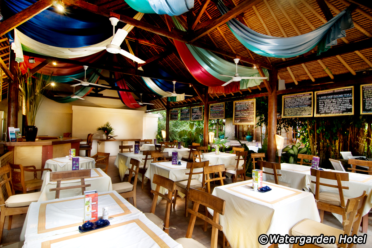 TJ’s Café used to be known as among the first dining venues to dot the Candidasa area a couple of decades ago. Now part of the Watergarden Hotel & Spa’s range of guest facilities, The Watergarden Kafe further offers a refreshing and relaxing atmosphere around shady tropical gardens and seats up to 40.Specialties on offer range from Mediterranean, European, Indonesian and Asian dishes, as well as the typical Balinese favourites to sample while on the island. Being a seaside restaurant, there are many seafood selections to choose from the menu. Freshwater fish can be picked from the live tank available at the small grill area near the bar.